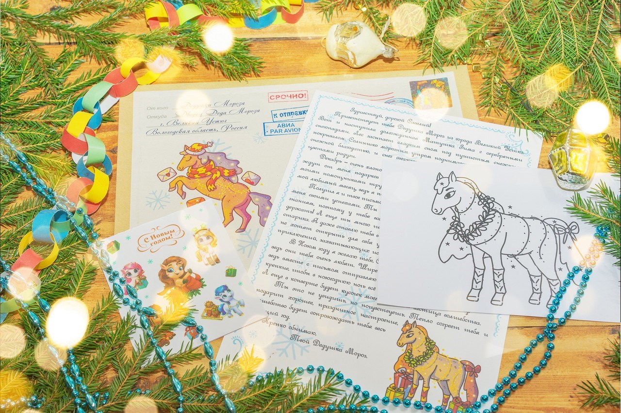 Письмо придет с выбранным вами дизайном. В базовую стоимость входит письмо, набор светящихся наклеек и авторская раскраска. Дополнительно вы можете добавить милые сувениры-вложения.